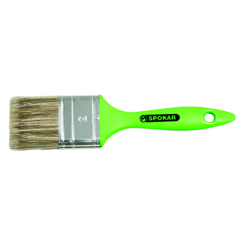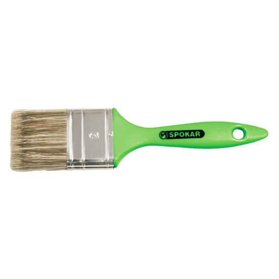 Четка за лазурен лак със зелена пластмасова дръжка и микс от синтетични влакна и естествен косъм. Бояджийската четка C1 Lazur на SPOKAR се използва за гланциране на дървени покрития. Четката притежава отвор на дръжката, позволяващ нейното удобно закачане, което улеснява използването й. Дължина на косъма: 46мм.