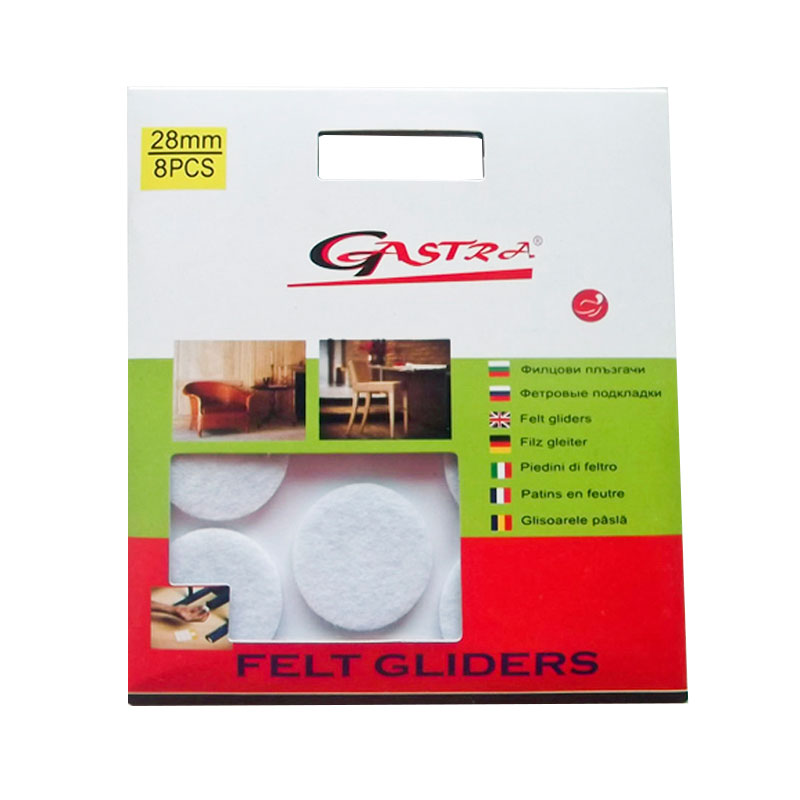 Самозалепващи филцови подложки на марката GASTRA с диаметър 28 мм в цвят бял. Подходящи са за залепяне на крака на столове, маси, бюра и др. Спомагат за по-лесното местене на мебелите и предотвратяват надраскването на подовите повърхности. Прилепват отлично на добре почистени места.