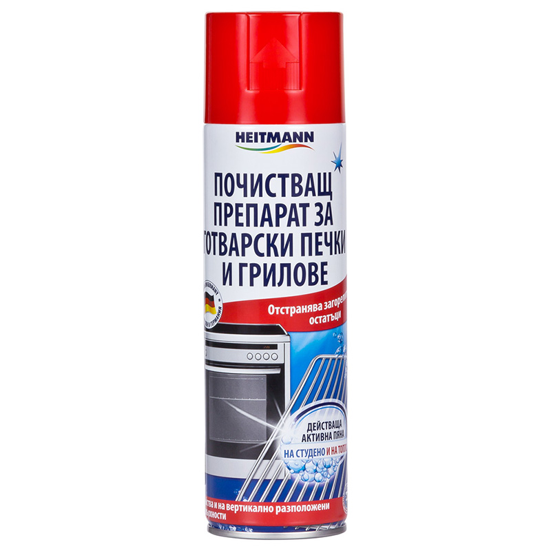 Препарат HEITMANN за почистване на фурни, скари и грилове. Притежава силно и мигновено действие. Препаратът HEITMANN разтваря загорелите остатъци от пържене, готвене, печене и грил. Премахва мръсотията от топли или студени фурни, готварски печки, котлони, тенджери, тигани, грилове и др. Пяната на флакона не се стича по повърхността, което я прави подходяща и за вертикални повърхности. Не е подходяща за използване върху алуминиеви, медни и лакирани основи, както и въздуховоди от ширмове. Може да се използва върху топли и студени повърхности. Предлага се в опаковка от 500мл.