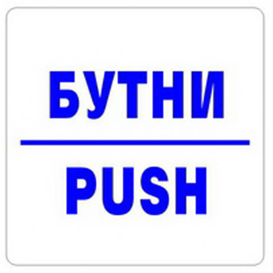 Самозалепващ стикер APLI с размери 114 х 114мм, предназначен е за стъклени врати, витрини и други. Този стикер е предназначен за залепяне от вътрешната страна на стъклото. Той се поставя с лице към прозрачната витрина или входа на един магазин, обществено учреждение и др. Стикерът е с надпис на два езика, указващ начина на отваряне на входната врата в една сграда.
