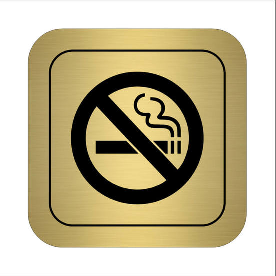 Обозначителен знак ЯНТЕР "Пушенето забранено", предназначен за поставяне на врата или стена. Пиктограмата е гравирана и е изработена от PVC с размери 95 x 95 x 1.5мм. Предлага се в златист цвят.