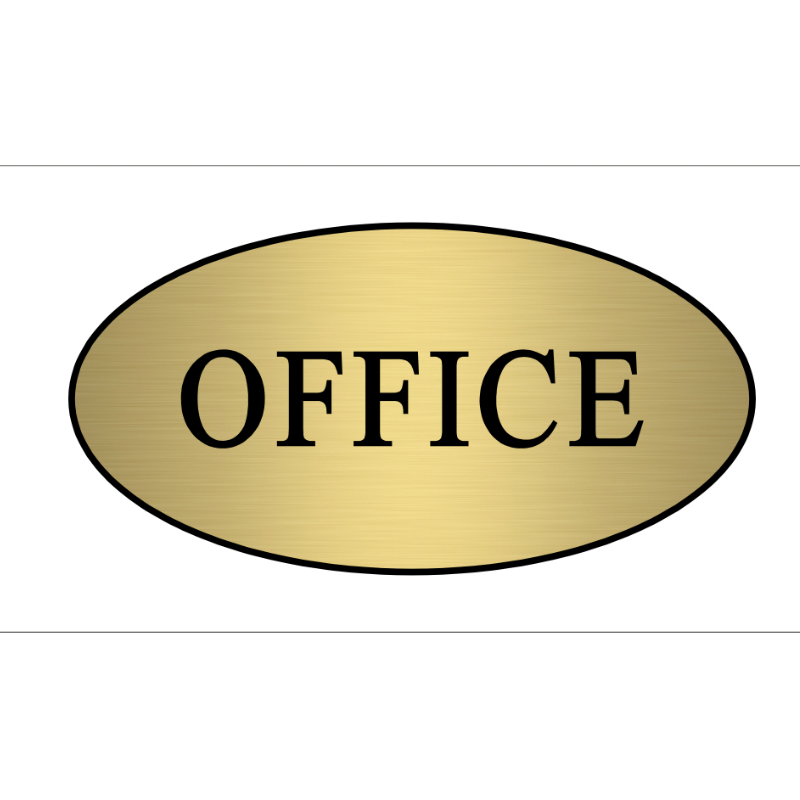 Обозначителен знак от ЯНТЕР "Office" в елипсовидна форма, предназначен за поставяне на врата или стена. Пиктограмата е гравирана и е изработена от PVC, с размер 100 x 50 x 1.5мм. Предлага се в златист цвят.