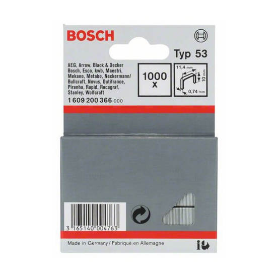 Метални скоби за ръчен такер TYP 53 на BOSCH. Скобите за такер са с дължина 10мм и широчина 11.4мм. Предлагат се в опаковка от 1000 броя.