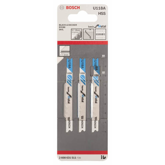 Комплект от 3 ножа за прободен трион на марката BOSCH U118А, предназначени за рязане на дърво или пластмаса.
