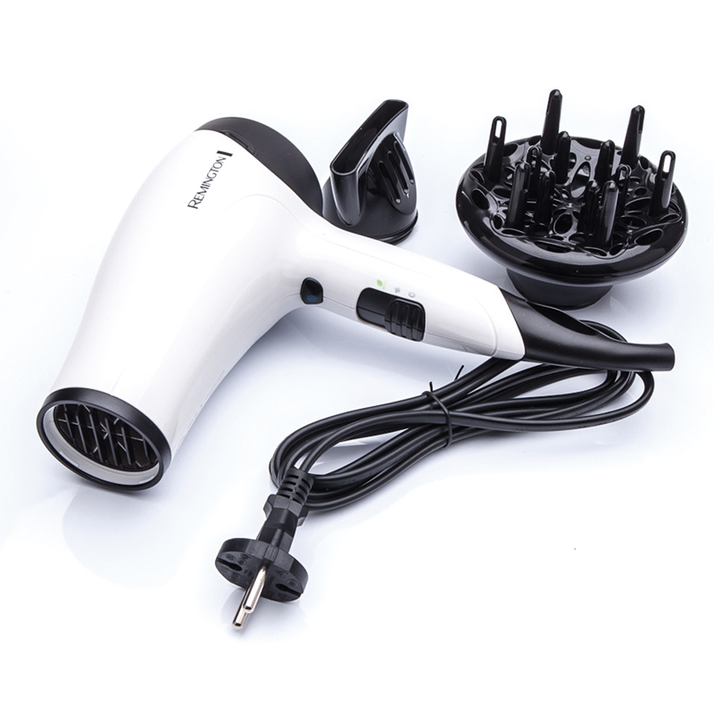 Сешоар за коса D3015 Power Volume на марката REMINGTON. Уредът е с мощност 2000W. Снабден е с йонизатор за антистатичен ефект и с концентратор. Разполага с керамична решетка за равномерно разпределение и отдаване на топлината. Притежава настройка за Еко режим на работа, която гарантира понижена консумация на електроенергия. Има и настройка за температурен контрол.