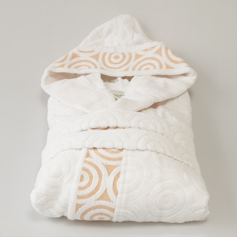 Мек и пухкав хавлиен халат за баня MAISONETTE в цвят бяло и оранжево. Изработен от 100% памук, 400 г/м2. Бързо абсорбира влагата. Моделът е подходящ за мъже и жени и с размер XXL.