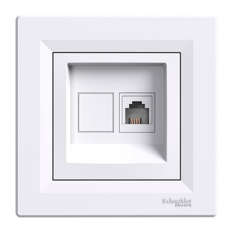 Единична телефонна розетка от серия ASFORA на SCHNEIDER ELECTRIC. Телефонната розетка е изработена от пластмаса в цвят бял. Притежава ниска защита от влага IP20.