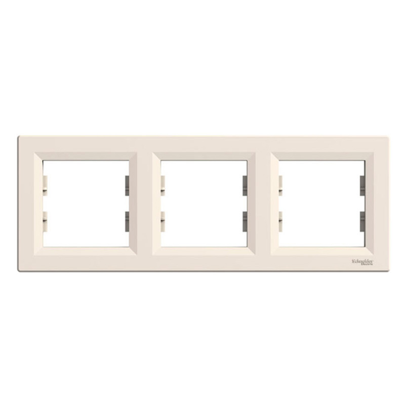 Тройна декоративна рамка-модул за хоризонтално монтиране на електрически ключове и контакти. Рамката е от серия ASFORA на SCHNEIDER ELECTRIC и е с цвят Крем. Предлага изчистен и стилен дизайн, подходящ за всяко помещение. Рамката е изработена от пластмаса и се монтира към ключовете или контактите посредством щипки.