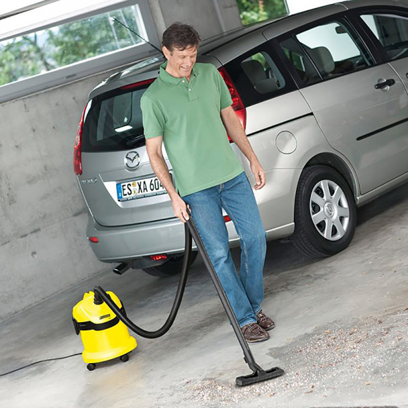 Моделът WD2 на KARCHER се характеризира с голяма мощност при по-ниска консумация на електроенергия. Оборудването включва порест филтър, който е предназначен само за употреба на мокри участъци. Електрическият кабел се окача на вградена кабелна кука и така е прибран и готов за употреба по всяко време.