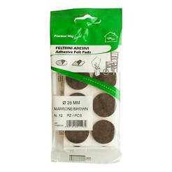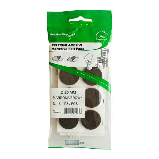 Комплект от 16 броя самозалепващи се предпазни подложки на марката ITALFELTRI в цветове бял и кафяв за крака на маси, столове и други мебели. Самозалепващите се подложки са с размер ф26мм и служат за предпазване на подовите настилки от надраскване, причинено от местенето на столове, маси или мебели. Могат да се използват и като буфер, предпазващ стените от удар от интериорните врати.