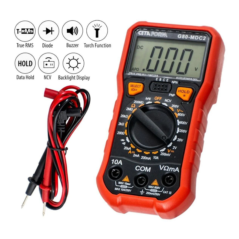 Дигиталният мултицет Ceta Form G80-MDC2 намира приложение при измерването на напрежение на постоянен ток (DCV), напрежение на променлив ток (АCV), силата на постоянен ток (DCА), съпротивление, диоден тест и тест за непрекъснатост на електрическа верига. Идеален е за хоби употреба и работни дейности в дома.