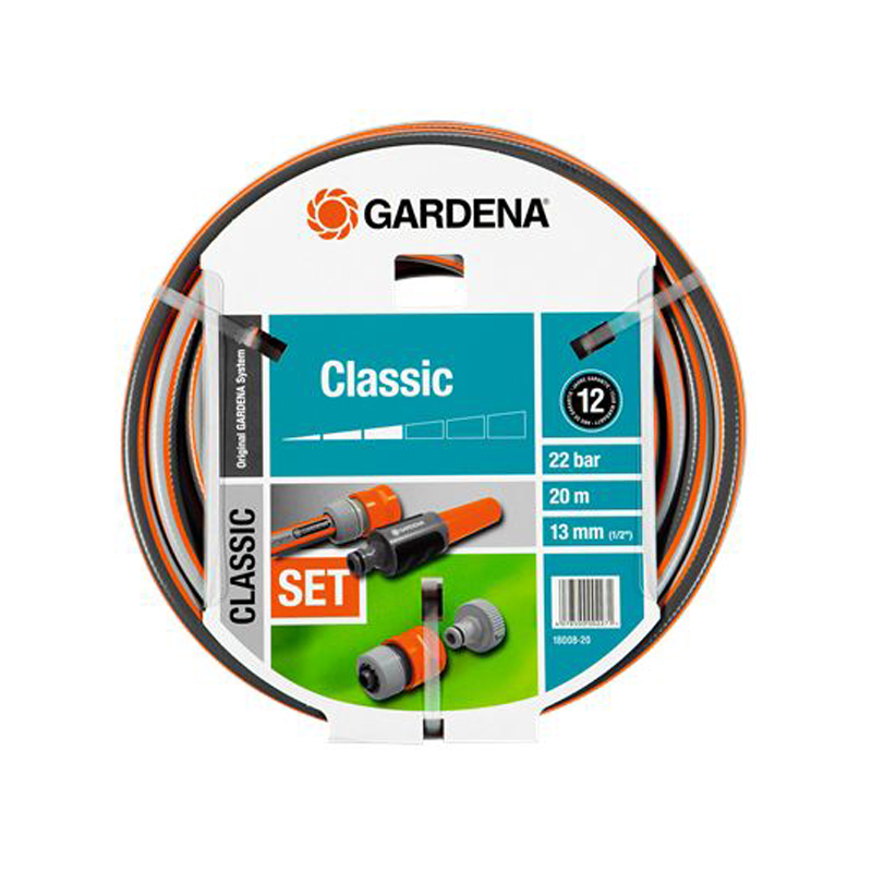Комплект маркуч от серия Classic с конектори на марката GARDENA. Опаковката съдържа маркуч Classic на GARDENA и различни части за свързване от Оригиналната система ГАРДЕНА.