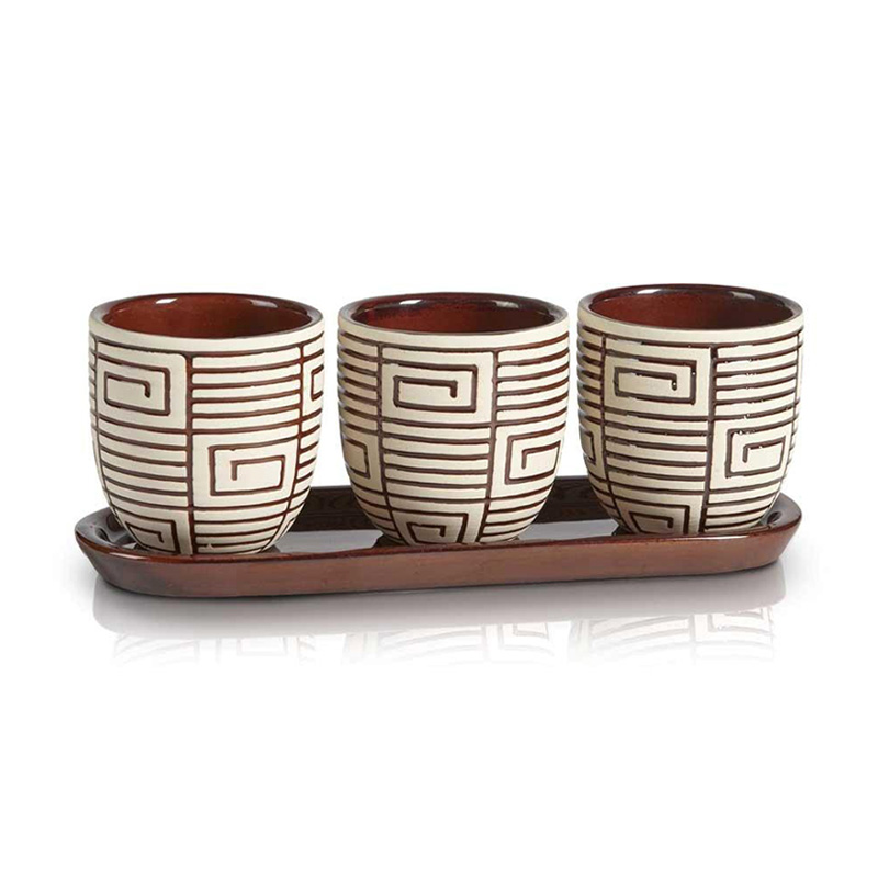 Комплект от 3 броя саксии с обща подложка от серията 23 collection на марката POLNIX. Комплектът е с размери 23 x 7 см. Изработен е от керамика. Орнаментите по стените на саксиите са в гръцки стил. Много подходящи са за кактуси. Идеални за декорация на дома.