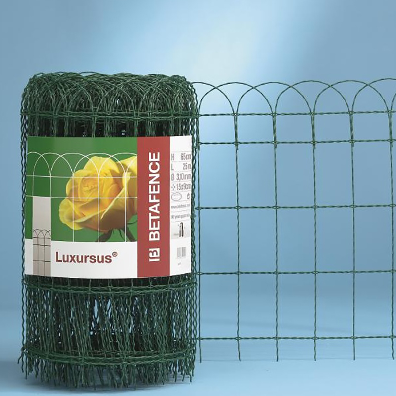 "LUXURSUS" е плетена оградна мрежа, направена от поцинковани телове с нанесено отгоре PVC покритие. Предназначени за ограждане на алеи, градинки и други с цел декорация. Тази мрежа е предвидена да се монтира директно чрез забиване в земята или може да се използват тънки стълбчета. Разполагат с 10 годишна гаранция против корозия. Характеристики:
