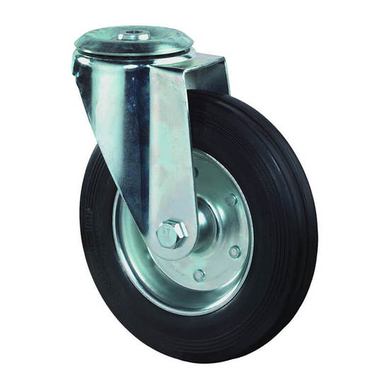 Въртящо колело на втулка BS ROLLEN Ф125мм представлява черно гумено колело с дискове от пресована стомана за индустриални приложения с леко натоварване. Центърът на колелото е от електролитно поцинкована ламарина. Главината е с полиамиден самосмазващ се обикновен отвор. Колелцето е подходящо при колички с леко натоварване. Предназначено за употреба на закрито-открито. Този тип колела са подходящи за всички видове подове, дори и навън на открито.