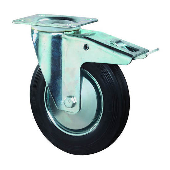 Въртящо колело на втулка и планка със спирачка BS ROLLEN Ф200мм представлява черно гумено колело с дискове от пресована стомана за индустриални приложения с леко натоварване. Центърът на колелото е от електролитно поцинкована ламарина. Главината е с полиамиден самосмазващ се обикновен отвор.