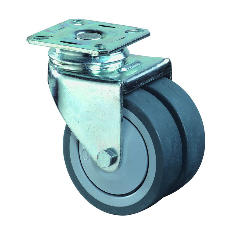 Въртящо колелце на планка с двойна сива гума BS ROLLEN Ф50 мм с полипропиленов център за институционални помещения. Гумата не оставя следи и има добра еластичност. Подходящи за използване на различни видове колички в институционалния сектор, както и за мебели. Намират приложение при колички в супермаркети и колички за инструменти с ниска товароносимост.