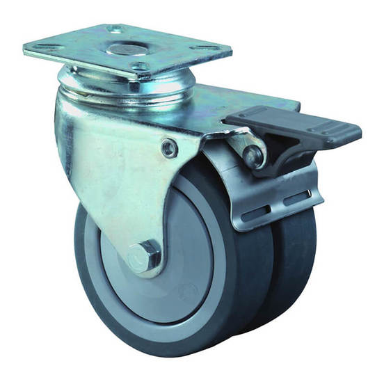 Въртящо колелце на планка и спирачка с двойна сива гума BS ROLLEN Ф50 мм с полипропиленов център за институционални помещения. Гумата не оставя следи и има добра еластичност. Подходящи за използване на различни видове колички в институционалния сектор, както и за мебели. Намират приложение при колички в супермаркети и колички за инструменти с ниска товароносимост.