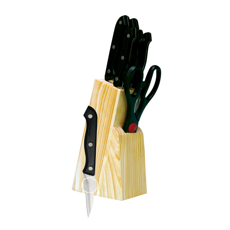 Комплект кухненски ножове от 7 части на марката ESPERANSA. Комплектът включва 5 ножа и ножица, подредени в красива поставка. Ножовете са с различна големина и предназначение. Изработени са от неръждаема стомана и имат полирана повърхност. Техните дължини са 20.3см /2бр./, 14см, 12.7см и 9см. Поставката е направена от дърво.