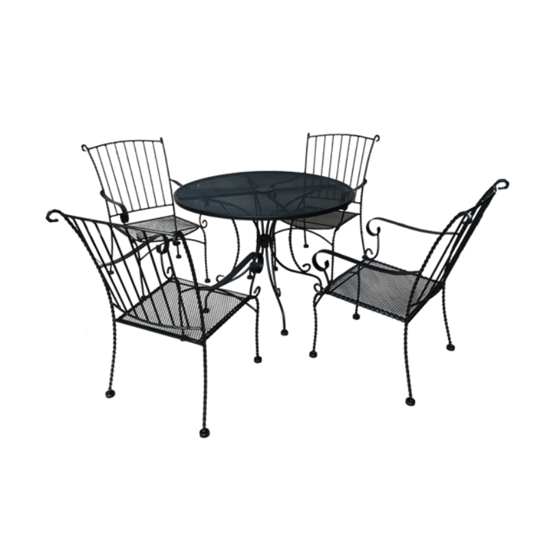 Градински комплект KING, изработен от ковано желязо. Състои се от 5 части: маса+4 стола. Масата е с размер ф100см.