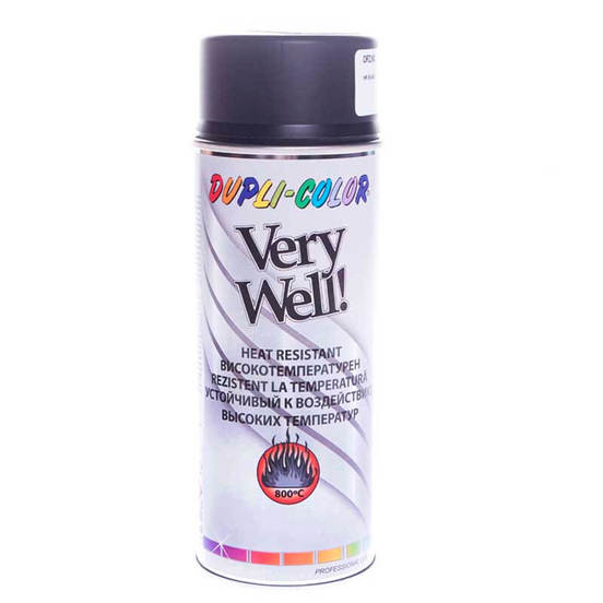 Високотемпературната акрилна спрей боя Very Well на DUPLI COLOR представлява термоустойчиво покритие за повърхности, подложени на високотемпературно въздействие. Спреят е подходящ за нанасяне върху нагряващи се метални повърхности като печки, ауспуси и гърнета на автомобили и др. Изсъхва на допир след около 10 до 30 мин, а напълно след 1 час. Може почти мигновено да се препокрива със следващ слой - лесно, удобно и без загуба на време. Високотемпературният спрей е изключотелно устойчив на атмосферни влияния, драскотини, бензин и масла. Спреят не капе при вертикално нанасяне.