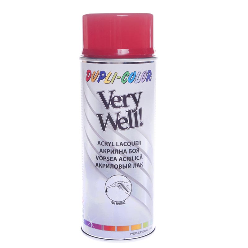 Акрилен спрей Very Well в цвят наситеночервен на DUPLI COLOR е във флакон от 0.4л. Спреят е висококачествена акрилна боя, съчетаваща в себе си предимствата на акрилните бои. Съхне на допир до максимум 30 минути, което я прави предпочитана дори и от непрофесионалисти. Акрилен спрей Very Well притежава специална формула, която прави слоят боя изключително устойчив на атмосферни влияния, бензин и масла. В комбинация с грунд осигурява отлична антикорозионна защита. Акрилният спрей Very Well на DUPLI COLOR е подходящ за нанасяне върху дърво, камък, стъкло, метал и пластмаса.