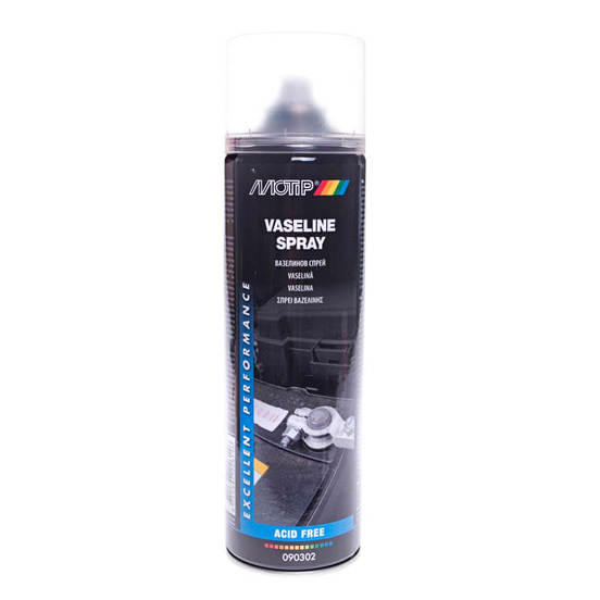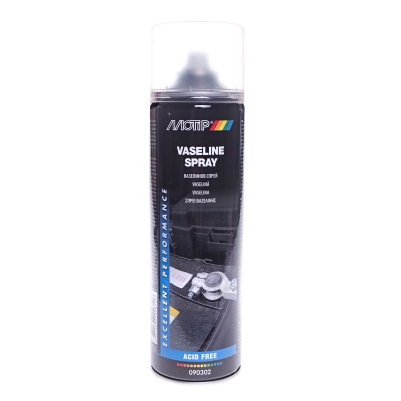 Вазелинов спрей MOTIP е във флакон от 0.5л и представлява универсално смазочно и предпазващо средство. Отблъсква водата, устойчив е на атмосферни влияния и слаби киселини и основи. Гарантирано защитава от корозия и износване. В допълнение към това предпазва и от полепване на мръсотия върху вече обработените детайли. Вазелинов спрей MOTIP се използва също и като средство за смазване и защита на метални и пластмасови плъзгащи връзки, заключващи части и механизми в автомобилите и др.