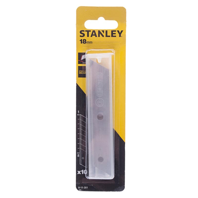 Комплект резервни остриета за макетен нож STANLEY. Всяко от остриетата е с дължина 115мм, широчина 18мм и дебелина 0.55мм. В един комплект се съдържат 10 броя ножчета.
