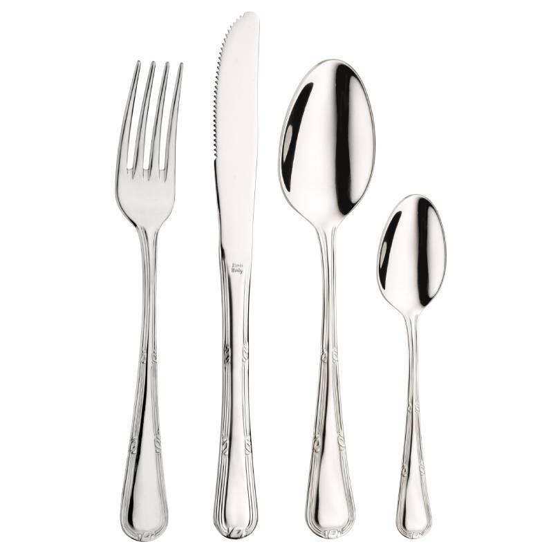 Комплект прибори за хранене от серията Valencia на марката PINTINOX. Комплектът съдържа 24 части, изработени неръждаема стомана с покритие от инокс 18/10 и с дебелина 2мм. Приборите за хранене са отлични за всекидневна употреба.