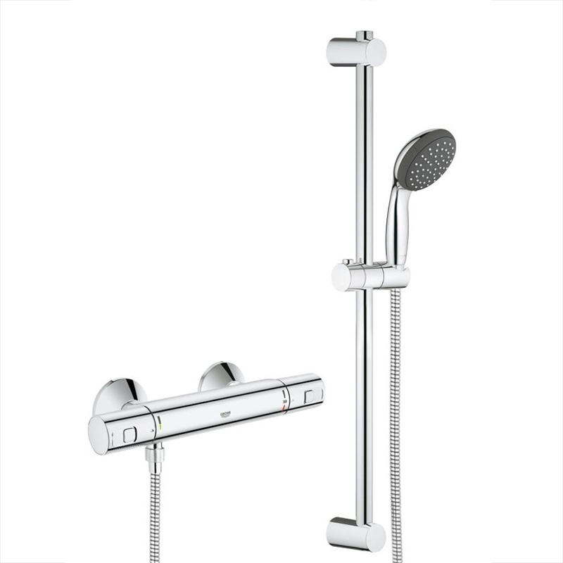 Термостатен стенен смесител за душ в комплект с аксесоари: тръбно окачване, шлаух и душ слушалка. Продуктите са от сериите Precision Start + Vitalio Start на марката GROHE. Смесителят е с 2 ръкохватки.