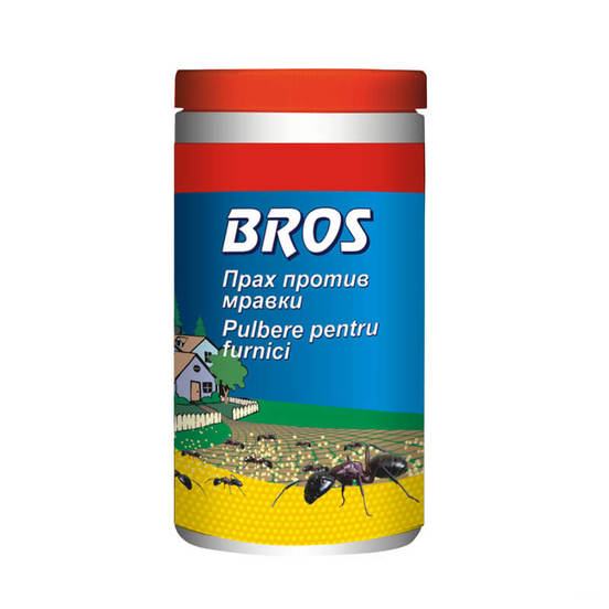 Пудра против мравки на марката BROS. Представлява инсектициден препарат, предназначен за употреба на закрито в помещения и на открито по тераси, беседки, до асми и др.