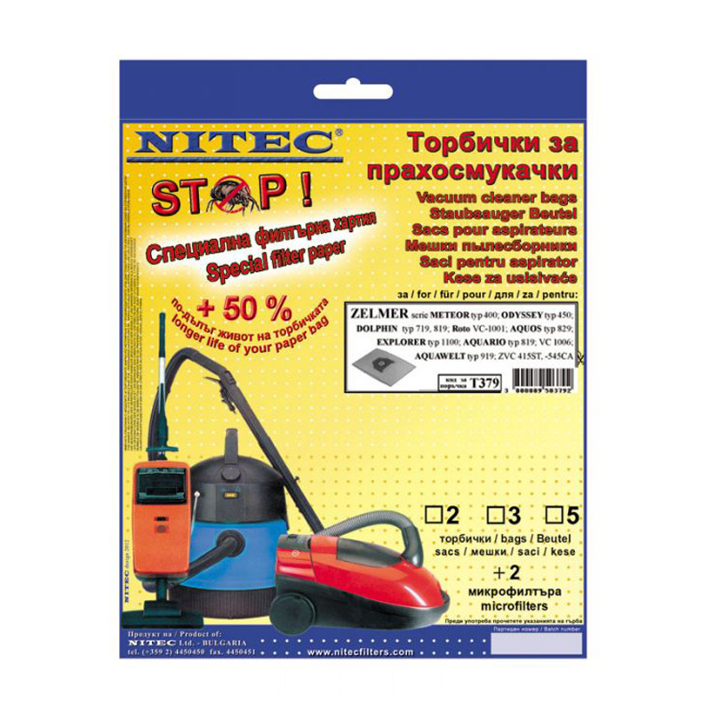 Комплект от 5 броя торбички + 2 броя микрофилтри за прахосмукачки на марката NITEC. Предназначени за модели прахосмукачки на марката ZELMER. Торбичките ефективно задържат и съхраняват събрания боклук. Лесно се слагат и вадят от прахосмукачките. Притежават дълготрайност и устойчивост дори и при честа употреба.