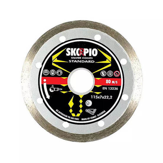Диамантен диск за ъглошлайф SKORPIO SILVER CONTI на SWATYCOMET за рязане на гранитогрес и керамика. Диамантеният диск е с размери 115 х 22.2мм и е подходяща за работа при тежки натоварвания. Дисковете от тази серия са специално сегментирани за оптимално охлаждане. Не е препоръчително да се реже асфалт или абразивни материали. Изработен е по модерна технология, която гарантира здравина и качество.