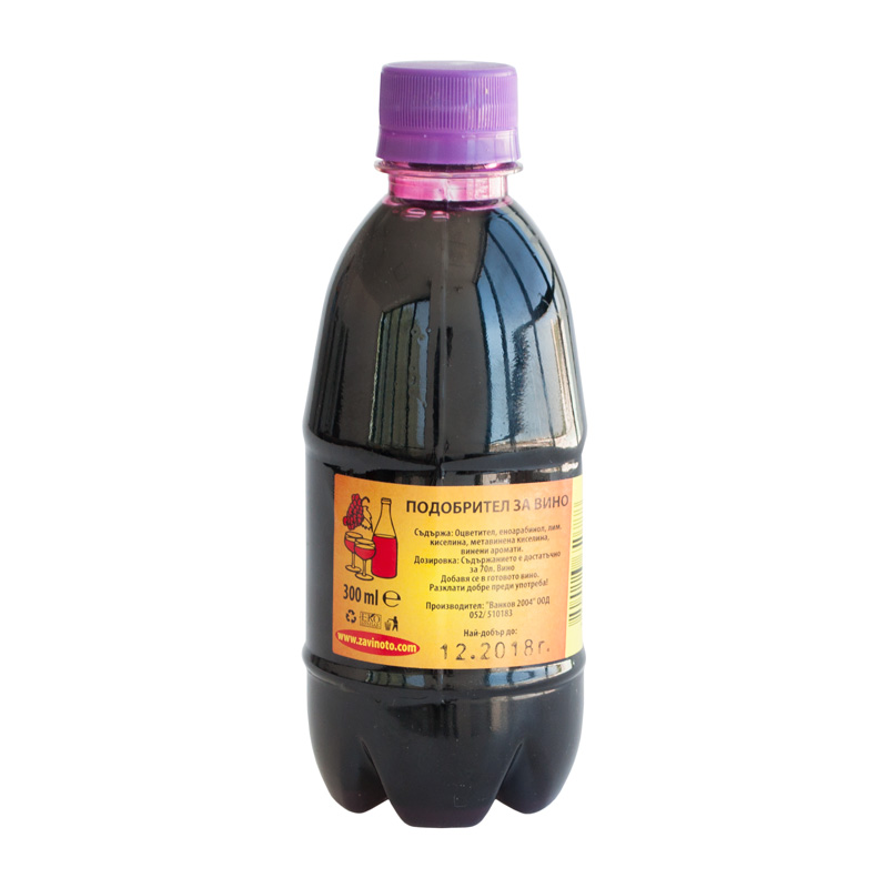 Подобрител за вино, предназначен за подобряване на вкусовите качества, аромата и цвета на домашната напитка. Съдържа: оцветител, еноарабинол, лимонена киселина, винени аромати. Продуктът е в разфасовка от 330мл, която подлежи на смесване с до 70л вино. Подобрителят за вино се добавя в готовия продукт. Да се разклати добре преди употреба.
