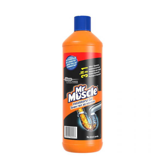 Гел за отпушване на канали на марката MR.MUSCLE. Препаратът е в течна форма. Особено ефективен е, когато се налага да се почисти домашната канализация.