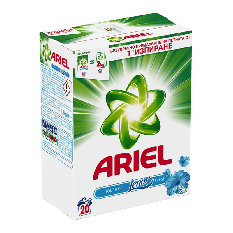 Прах за пране Ариел от вида LENOR FRESH. Препаратът е предназначен за 20 изпирания. Прахът за пране се предлага в удобна опаковка от 1.3 кг.