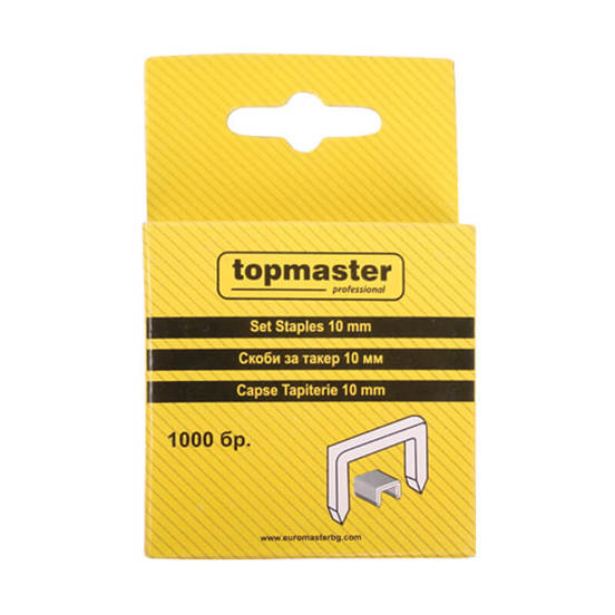 Комплект от 1000 броя стоманени скоби за такер, предназначени за закрепяне на кабели по бетонени и дървени повърхности. Скобите за такер са с размер 14мм и са изработени от твърда стоманена тел. Могат да се използват от такери на марката TOPMASTER.