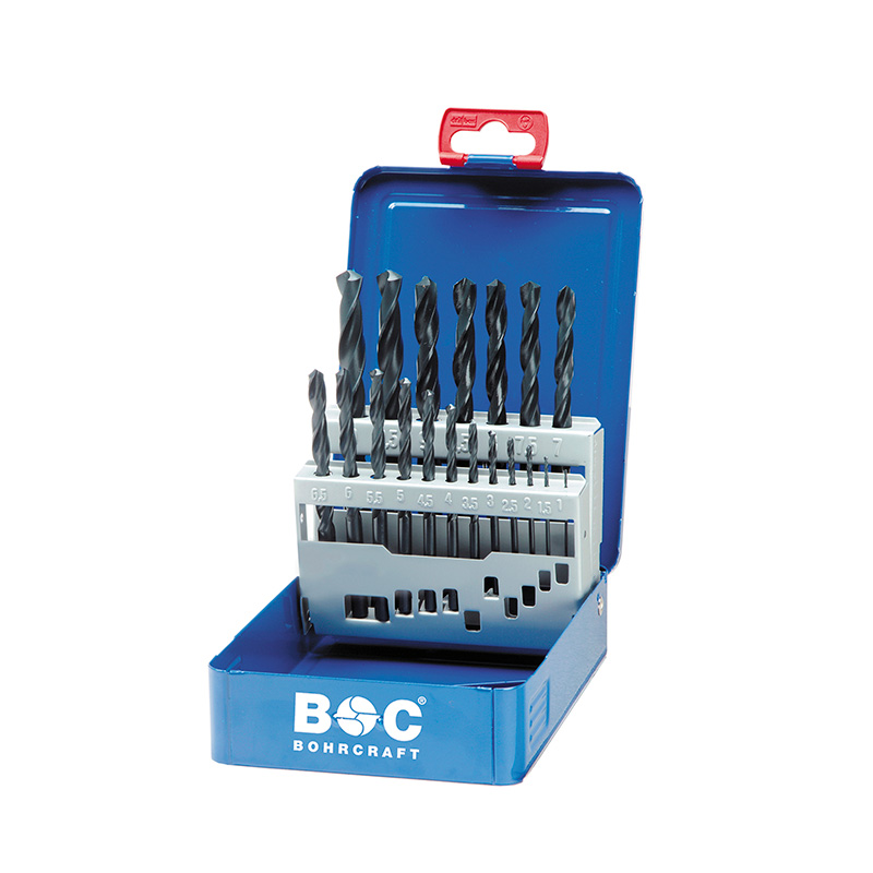 Комплект от свредла за метал, произведени от немската компания BOHRCRAFT. Свредлата са изработени от висококачествена HSS стомана, с диаметри от 1.0 мм до 10 мм. Покриват международните стандарти за ефективност и надеждност. Устойчиви са на износване, корозия и дълготрайна употреба. Подсилената централна част на свредлото гарантира неговата по-висока устойчивост, като позволява извършването на професионални пробивни дейности. При тази работа се постигат съвсем минимални отклонения, по отношение на качеството на разпробиване. Устойчивостта и якостта на свердлото гарантират и неговия по-продължителен експлоатационен живот. Инструментът е с меден край, допринасящ за ефективността на разпробиването. Подобни видове накрайници се използват, когато е необходимо извършването на директно разпробиване, без предварително центриране на свредлото. Пробиването на отвори в метал и стомана става, без допълнително усукване на свредлото, както и задаването на по-голяма мощност на бормашината.