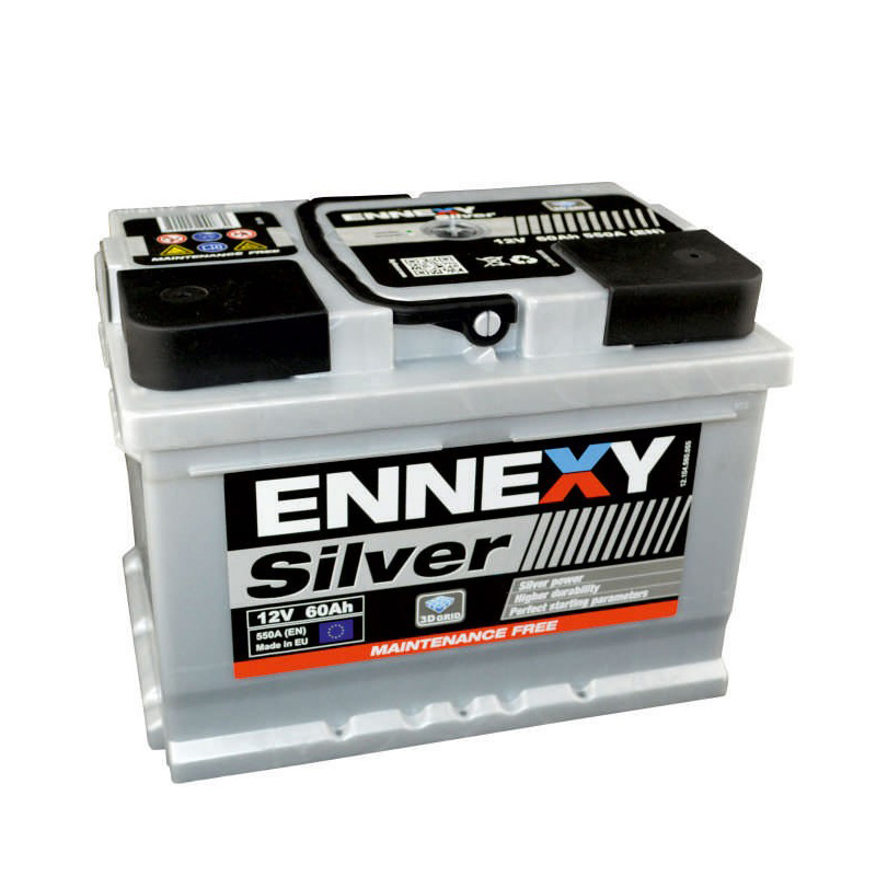 Автомобилният акумулатор ENNEXY Silver 60 Ah/550A е капсулован и необслужваем. Намира приложение за мощни бензинови и дизелови двигатели. Автомобилният акумулатор се характеризира с високия си стартов ток и стабилна конструкция. Дори при по-ниски и минусови температури, акумулаторът ENNEXY Silver запазва своя висок стартов ток и устойчивост. На корпуса си, акумулатора има индикатор, който показва състоянието на заряда. Притежава също така висока антикорозионна устойчивост. Това се дължи на материалите, използвани за направата му.