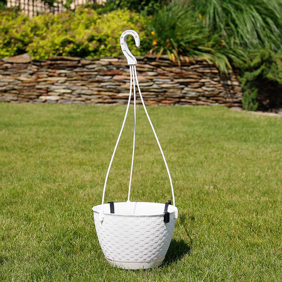 Стилна и качествена висяща саксия за цветя от серия RATOLLA ROUND на марката PROSPERPLAST, изработена от изкуствен ратан в цвят бял. Висящата саксия може да се постави както в градината и на терасата или верандата, така и в жилищните помещения. Тя е устойчива на UV лъчи и атмосферни влияния, което е гаранция за дълъг период на употреба. Подходяща е за всякакъв вид градински или стайни висящи растения. Моделът е с диаметър ф22см и височина 14см. Обемът на саксията е 3.5л.