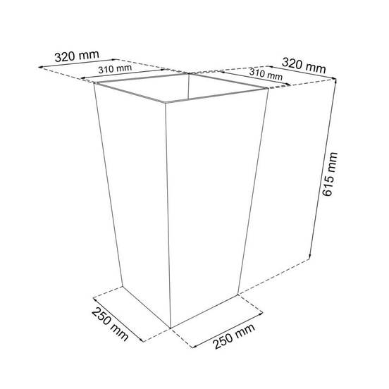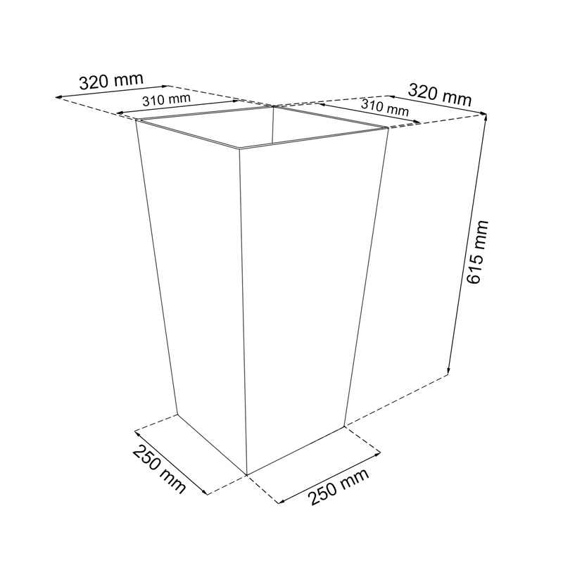 Кашпите нямат дренажни отвори и в тях не е препоръчително директно да се засаждат растения, макар че понякога това се практикува. Кашпата трябва да е поне два-три сантиметра по-голяма от саксията, за да се осигури добра циркулация на въздуха. Продуктът е с размери 32 х 61см. Вместимостта на кашпата е 49л.