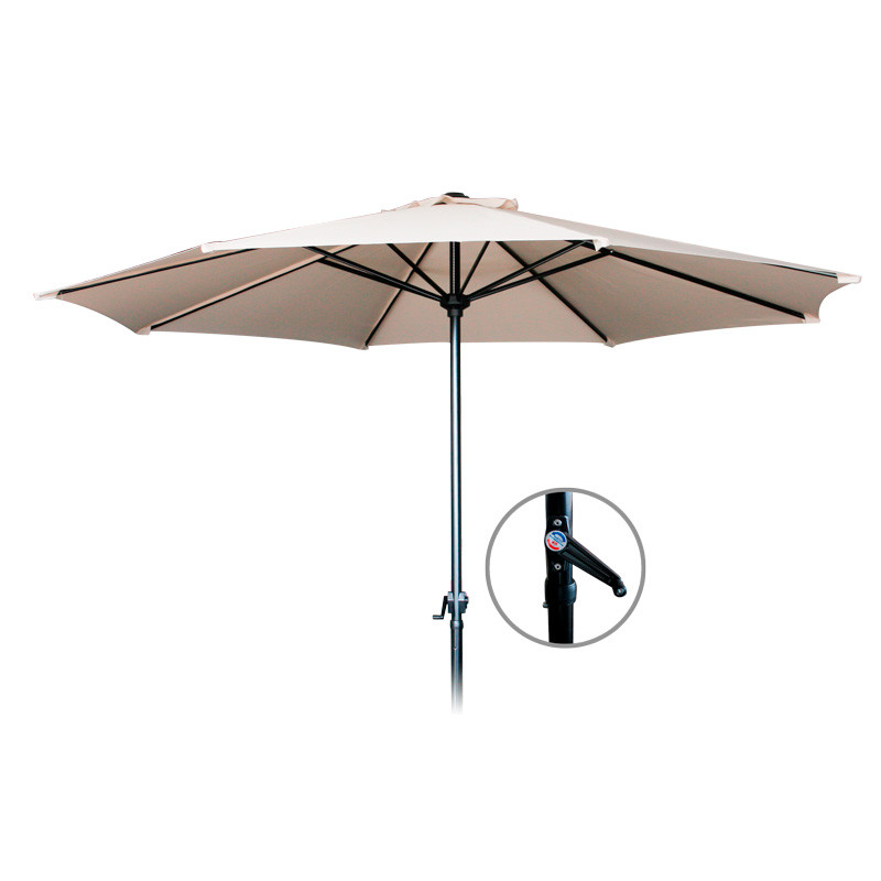 Голям градински чадър без стойка, изработен от висококачествени материали в цвят бежов. Чадърът е подходящ за използване в заведения и кафенета, а също така и за поставяне в двора или градината. Устойчив е на UV лъчи и неблагоприятни атмосферни условия. Градинският чадър е изработен с метална тръбна конструкция. Разполага с удобен и лесен за използване механизъм за сгъване и разгъване. Диаметърът на модела е Ф 250см.