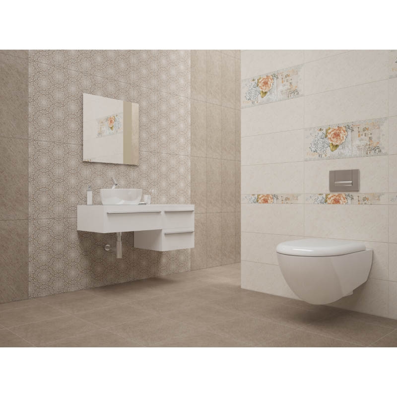 Фриз KAI серия Ажур Роза, с размери 6 х 50 см. и светлобежов цвят. Този модел е още една серия за баня, вдъхновена от тенденцията за използването на текстилен дизайн върху керамични повърхности. По повърхността на фаянсовите плочки се забелязват ефектно вплетени текстилни нишки, което ги превръща в красив и необходим интериорен елемент за всяка баня. Серията Ажур се предлага с гланцирано покритие.