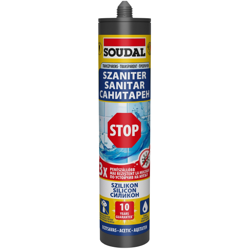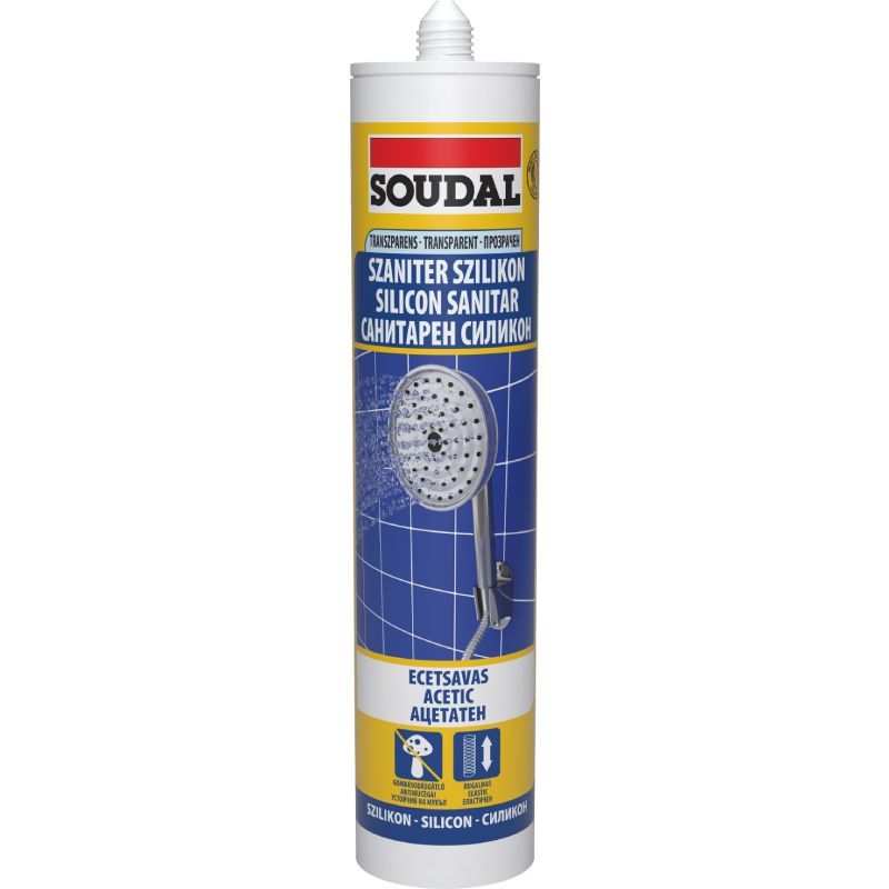 Санитарният силикон Soudal е еднокомпонентен, бързо втвърдяващ уплътнител на основата на силиконови полимери, който втвърдява чрез оцетна реакция. Създаден е специално за приложения в санитарни помещения, където се изисква надеждно уплътняване и дълготрайна защита срещу влага, плесен и мухъл. Продуктът е предназначен за използване в бани, кухни и тоалетни, като намира приложение при уплътняване на фуги, отвори и съединения около мивки, вани, душ кабини, писоари и мебели за баня. Благодарение на своята устойчивост на вода и почистващи препарати, той е идеален избор за санитарни пространства с висока влажност и честа употреба. Санитарният силикон Soudal прилепва отлично към различни видове повърхности като стъкло, керамика, бетон, санитария и кухненски плотове. Той осигурява надеждна и здрава връзка, устойчива на препарати за почистване и детергенти, като същевременно остава постоянно еластичен и гъвкав след пълното си втвърдяване.