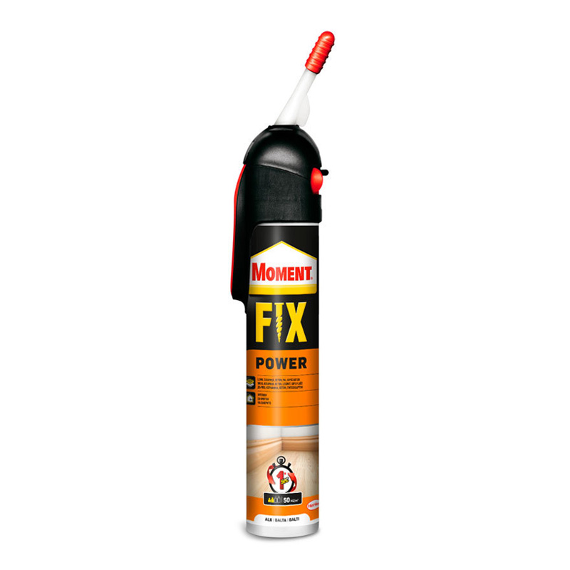 Монтажното лепило MOMENT Fix Power осигурява незабавно слепване към основата без необходимост от допълнително закрепване. Лепилото е с пригоден накрайник, който ще допринесе за по-лесно нанасяне без да е необходим пистолет. Монтажното лепило Fix Power предлага висока начална якост до 50кг/кв.м., благодарение на която ще може да монтирате тежки елементи без да е нужна употребата на винтове, пирони и дюбели.