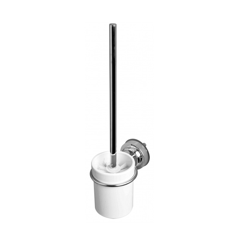 Пластмасова четка за тоалетна с хромирани части, монтираща се чрез вакуум прикрепване към стената. Стенният монтаж чрез вакуум залепване спестява нуждата от пробиване на плочките в банята, лепене със силикон и използването на допълнителни инструменти за монтаж. Изработена е от висококачествен PVC материал, устойчив на температурни промени, влага и механични промени. Хромираната повърхност на дръжката гарантира по-високата хигиеничност на четката. Поставката на четката е с кръгла форма. Аксесоарът за баня притежава изчистен, класически дизайн, който би бил подходящ за всяка баня.