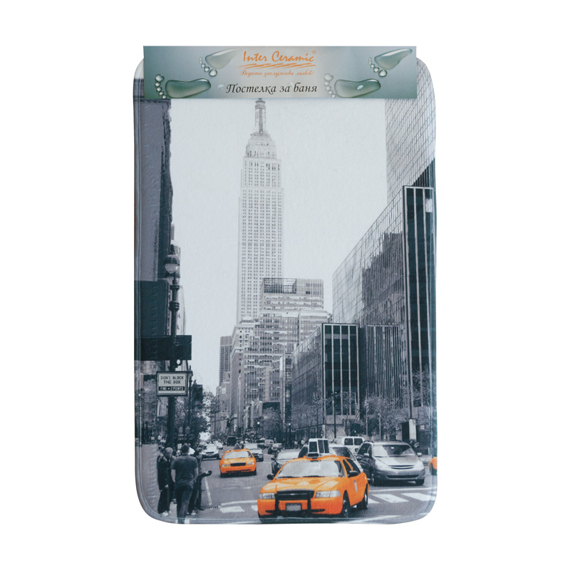 Постелка за баня INTER CERAMIC с правоъгълна форма и с размери 45 x 70см. Постелката е с десен "Ню Йорк". Горната част на постелката за баня е изработена от 100% микрофибър, а долната част е 100% синтетична гума. Синтетичната гума няма да позволи хлъзгане на постелката за баня. Дизайнът на постелката с морски мотиви създава настроение и добавя ново очарование в интериора на вашата баня.