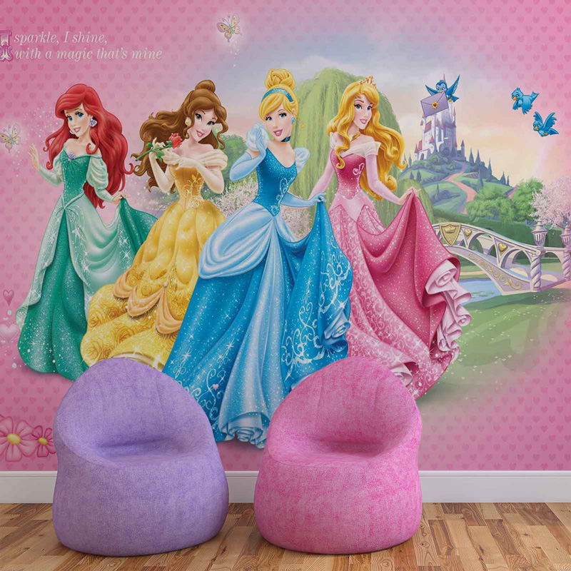 Висококачествен, широкоформатен фототапет за детска стая с изображение на принцеси от популярни детски филмчета на Дисни. Фототапетът е подходящ за поставяне на стената във всяко помещение, което не е изложено на високи нива на влажност.