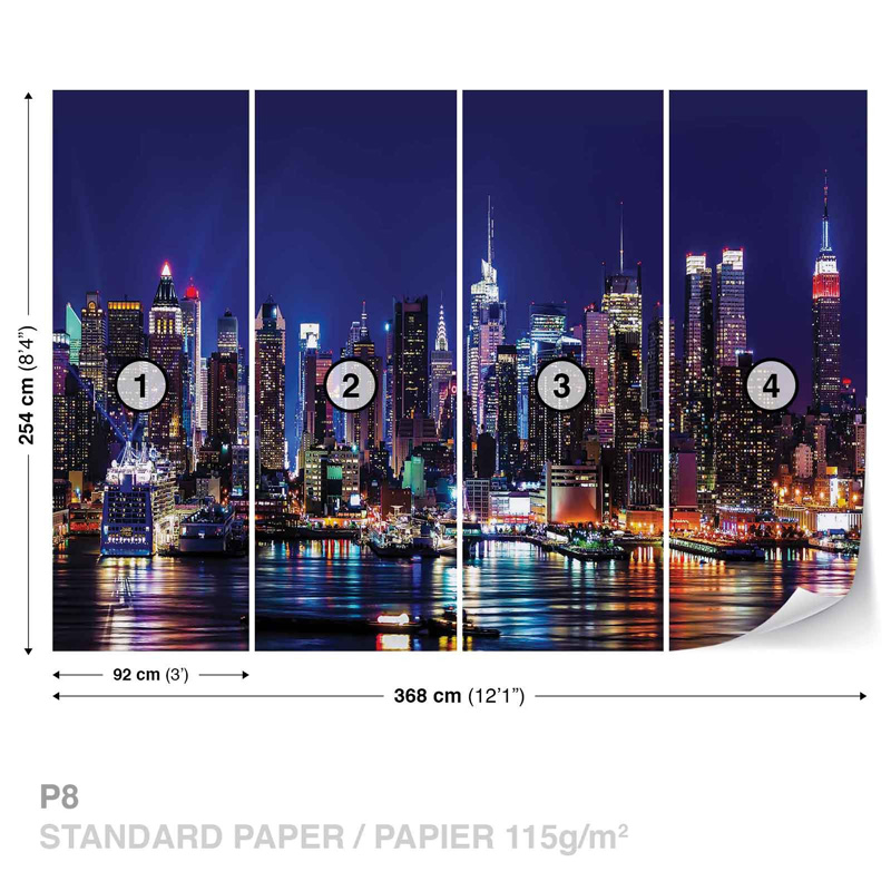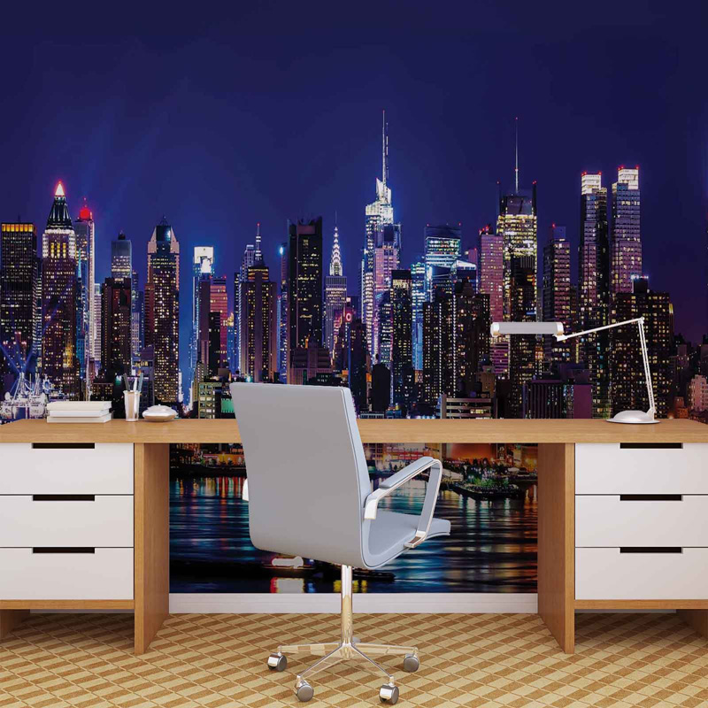 Висококачествен, широкоформатен фототапет на нощен Ню Йорк, облян в светлини. Фототапетът е подходящ за поставяне на стената във всяко помещение, което не е изложено на високи нива на влажност.