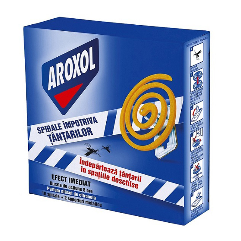 Комплект от 10 броя инсектицидни спирали против комари AROXOL. Тяхното действие е свързано с отделянето при изгаряне пари, които отблъскват комарите. По този начин се възпрепятства навлизането на крилатите насекоми в помещенията, където са поставени спиралите. Комарите, които са останали в стаите, са "парализирани" и не хапят.